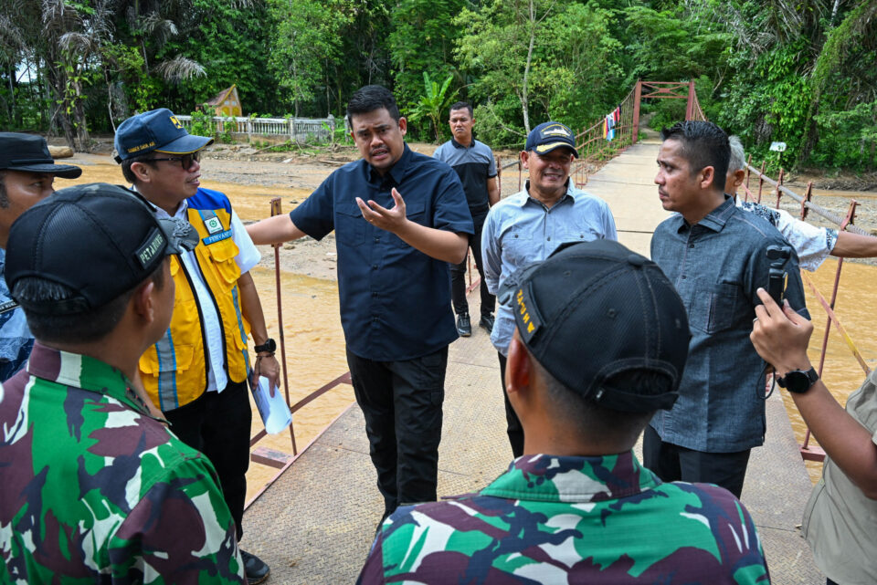 Gubernur Sumut, Bobby Nasution meninjau kondisi tanggul sungai yang rusak akibat banjir di Kecamatan Tukka, Kabupaten Tapanuli Tengah, Kamis (19/2/2026). (Diskominfo Sumut).