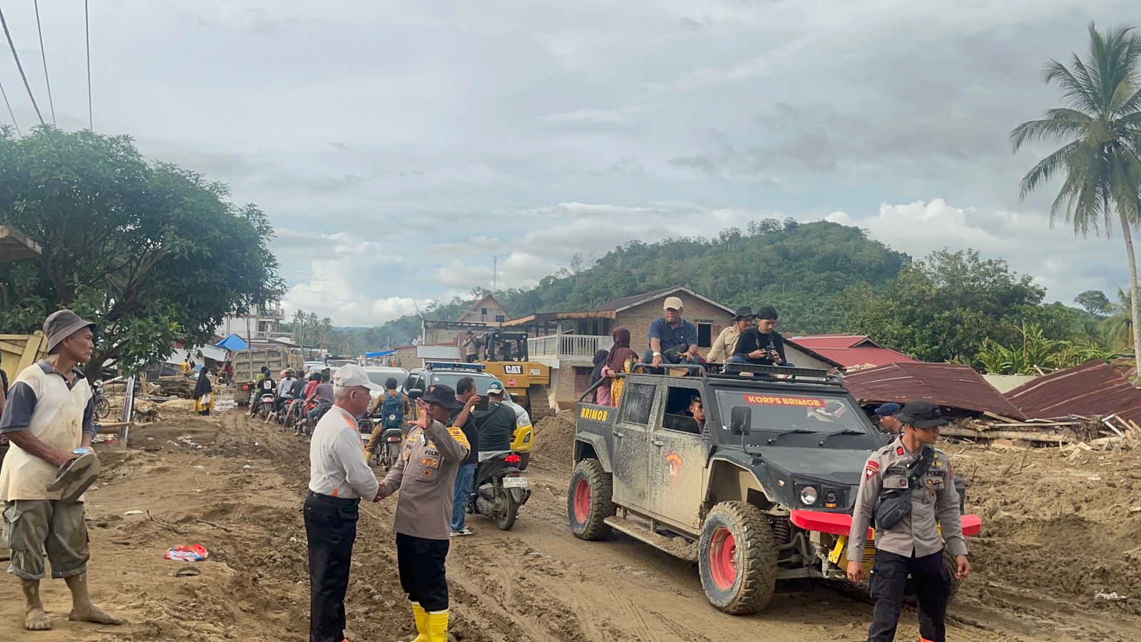 Selain pembersihan, personel Brimob juga mengatur arus lalu lintas sekaligus mengawal keberadaan alat berat yang dikerahkan untuk membuka akses jalan yang tertimbun lumpur.