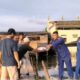 Proses ini dilakukan menggunakan peralatan manual seperti cangkul, sekop, dan angkong untuk mengangkat lumpur yang memenuhi ruangan rumah.