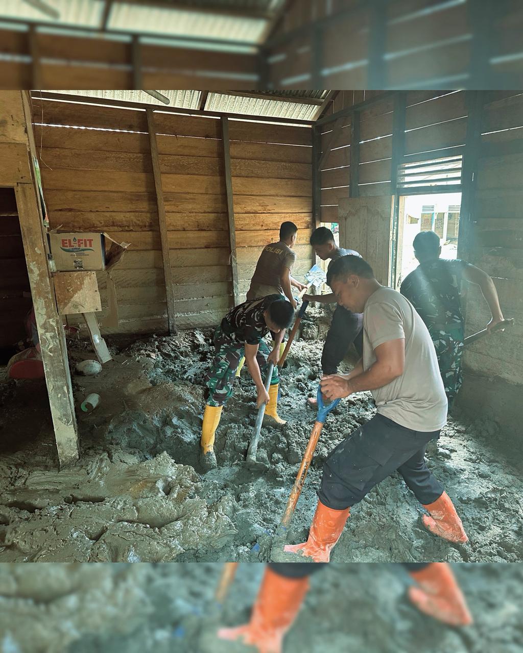 Dengan semangat gotong royong, personel membersihkan lumpur, pasir, dan material sisa bencana yang menimbun rumah warga serta fasilitas ibadah.