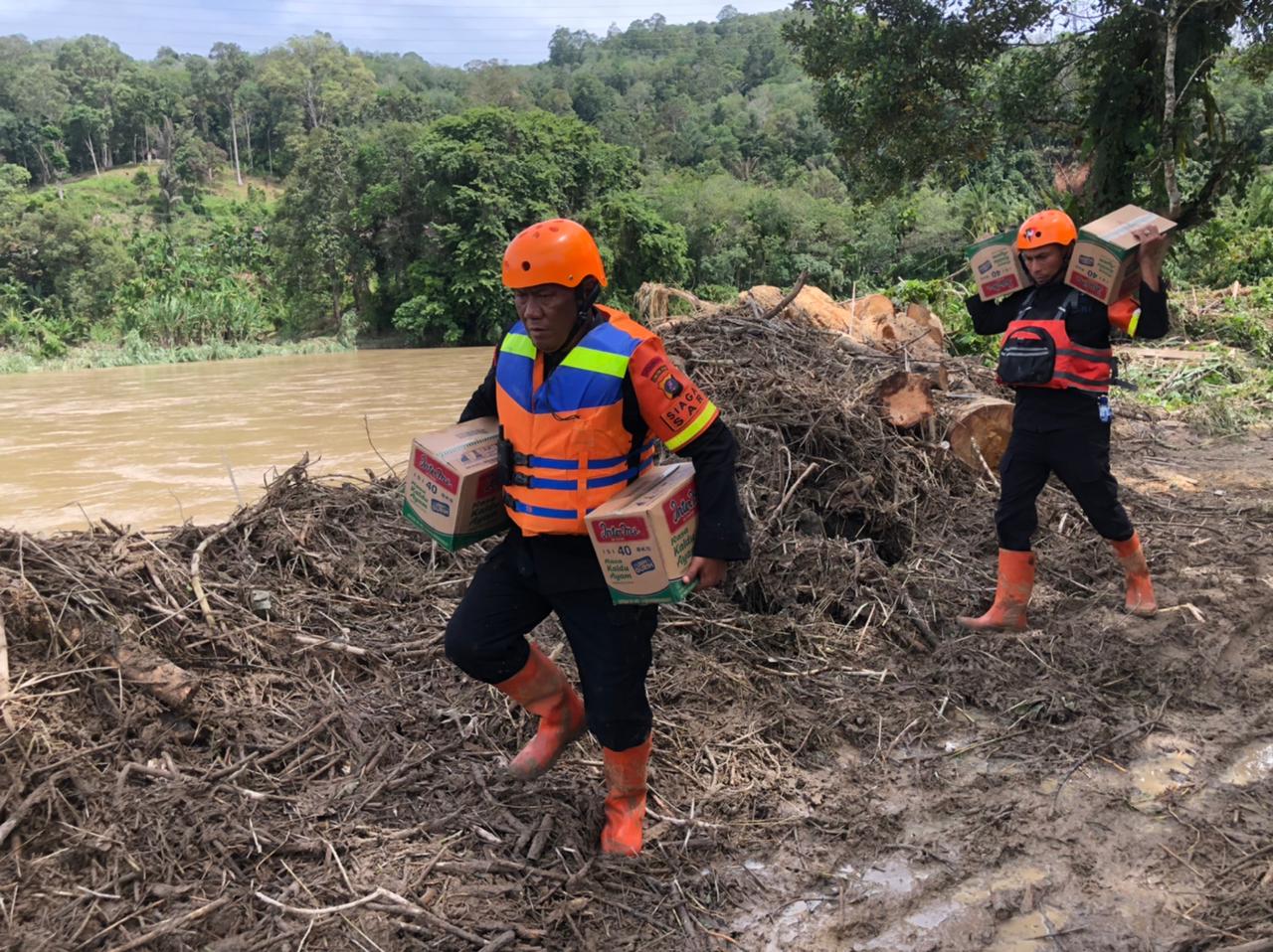 Mereka akhirnya memutuskan membawa logistik secara manual memanggul dus sembako dan menggendong paket makanan menembus jalur berlumpur menuju Desa Robean dan Sibulan Bulan.