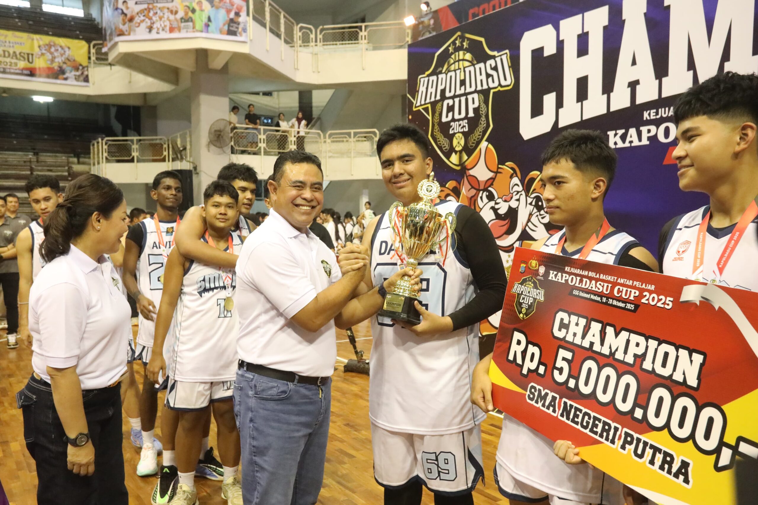 Ribuan penonton bersorak riuh menyaksikan laga puncak Kapoldasu Cup 2025, turnamen bola basket bergengsi antar pelajar SMA/SMK dan mahasiswa se-Sumatera Utara.
