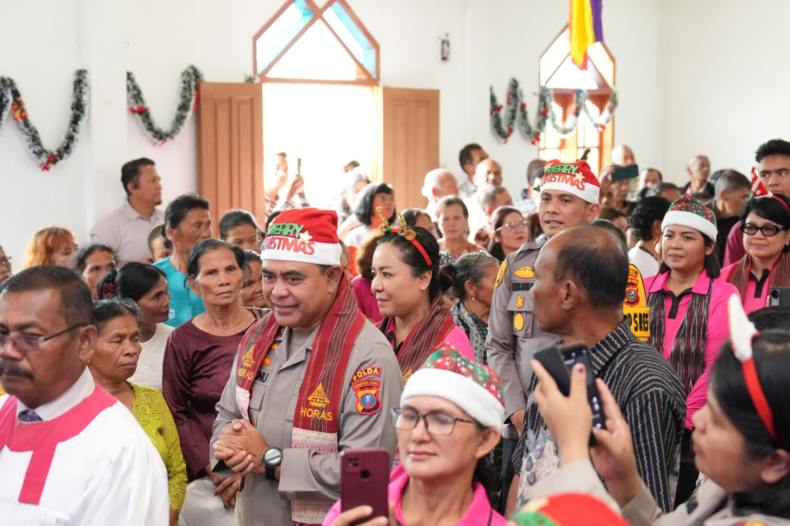 Kapolda Sumut hadir didampingi Ketua Bhayangkari Daerah Sumatera Utara Ny. Mona Whisnu Hermawan, jajaran pejabat utama Polda Sumut, pengurus Bhayangkari, unsur Polres Tapanuli Utara, tokoh gereja, serta masyarakat Adiankoting.