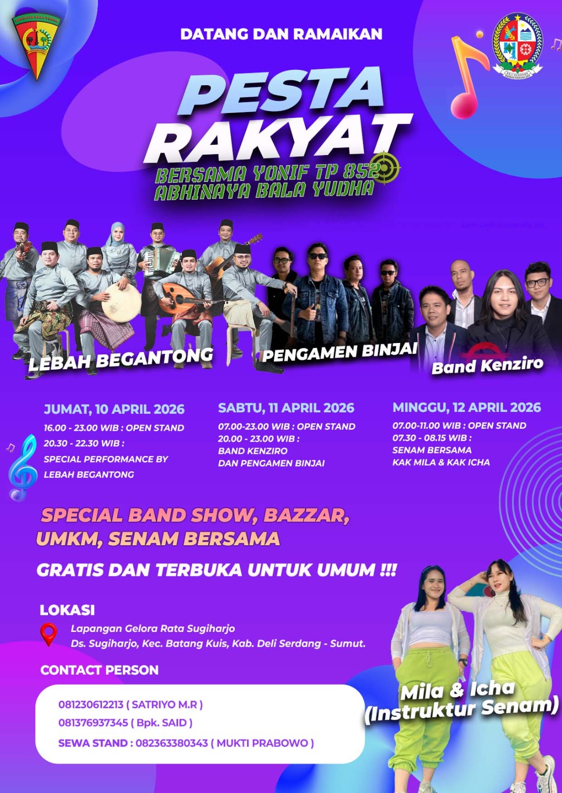 Akan disuguhkan kemeriahan Pesta Rakyat Bersama Yonif TP 852/Abhinaya Bala Yudha yang digelar selama tiga hari, mulai 10 hingga 12 April 2026.