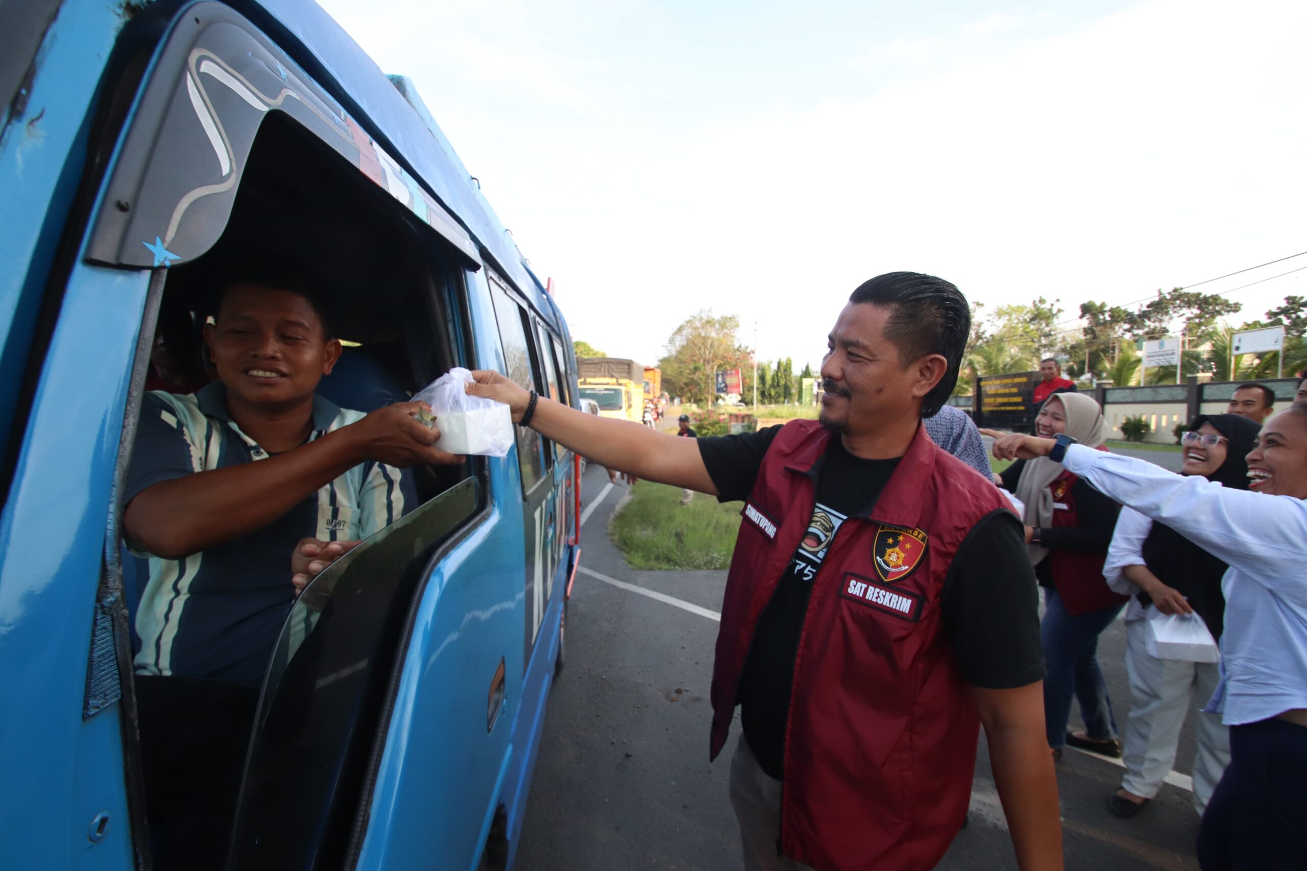 Personel turun langsung ke pinggir jalan untuk menyapa dan menyerahkan takjil kepada masyarakat yang sedang dalam perjalanan menjelang waktu berbuka puasa.