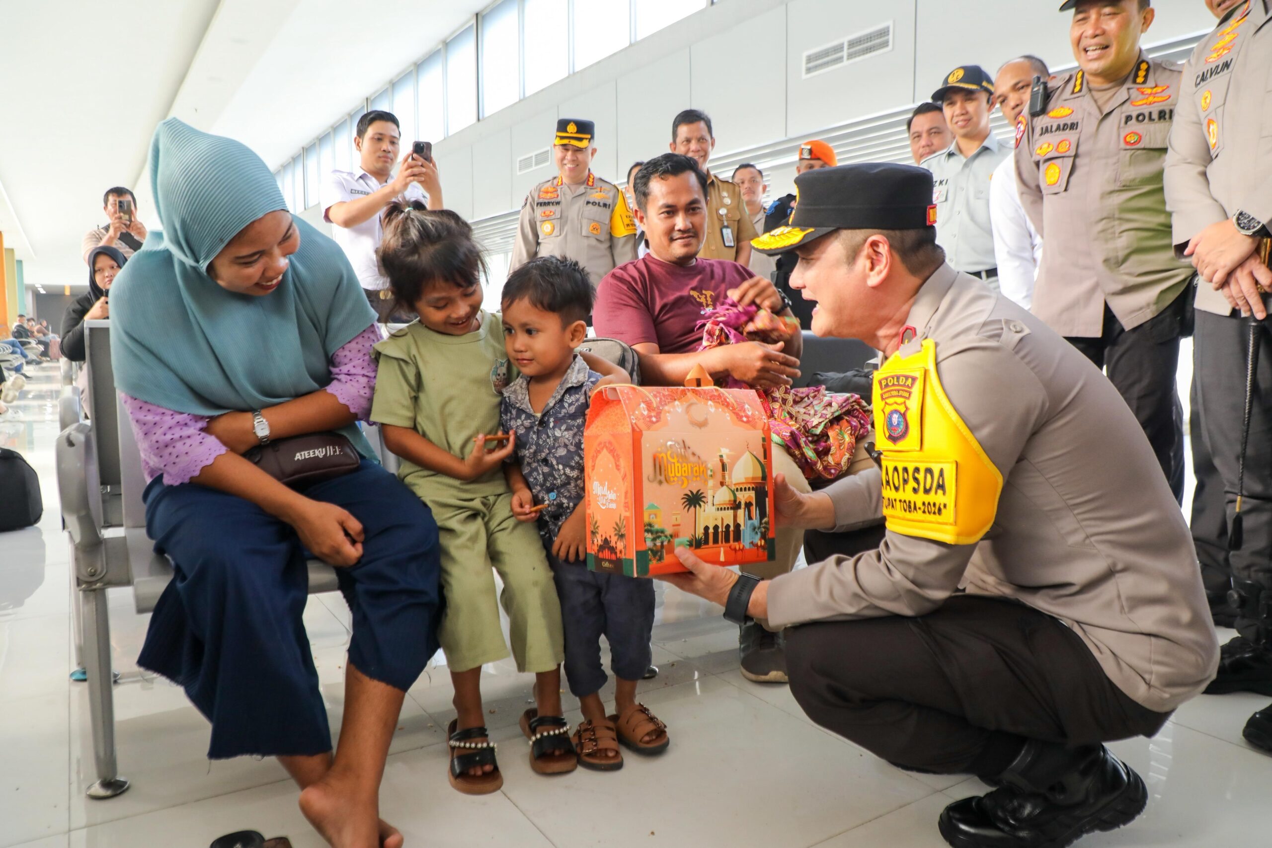 Ia menyapa sejumlah penumpang sekaligus menyerahkan hampers secara simbolis sebagai bentuk perhatian Polri kepada masyarakat yang akan pulang ke kampung halaman.